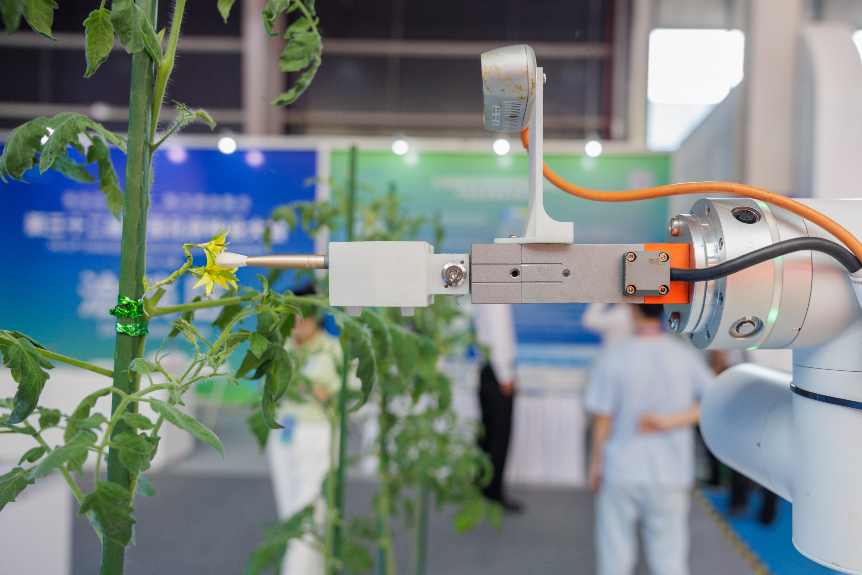 在活动现场,由我国自主研发的世界首台育种机器人“吉儿”现场为番茄花授粉,引起观众热情围观。通过深度学习,机器人可以精准识别花朵和花蕊,机械臂上的小刷子找到开放的花朵,稳稳地蘸取花粉并涂抹到柱头上,完成一次授粉仅需15秒。