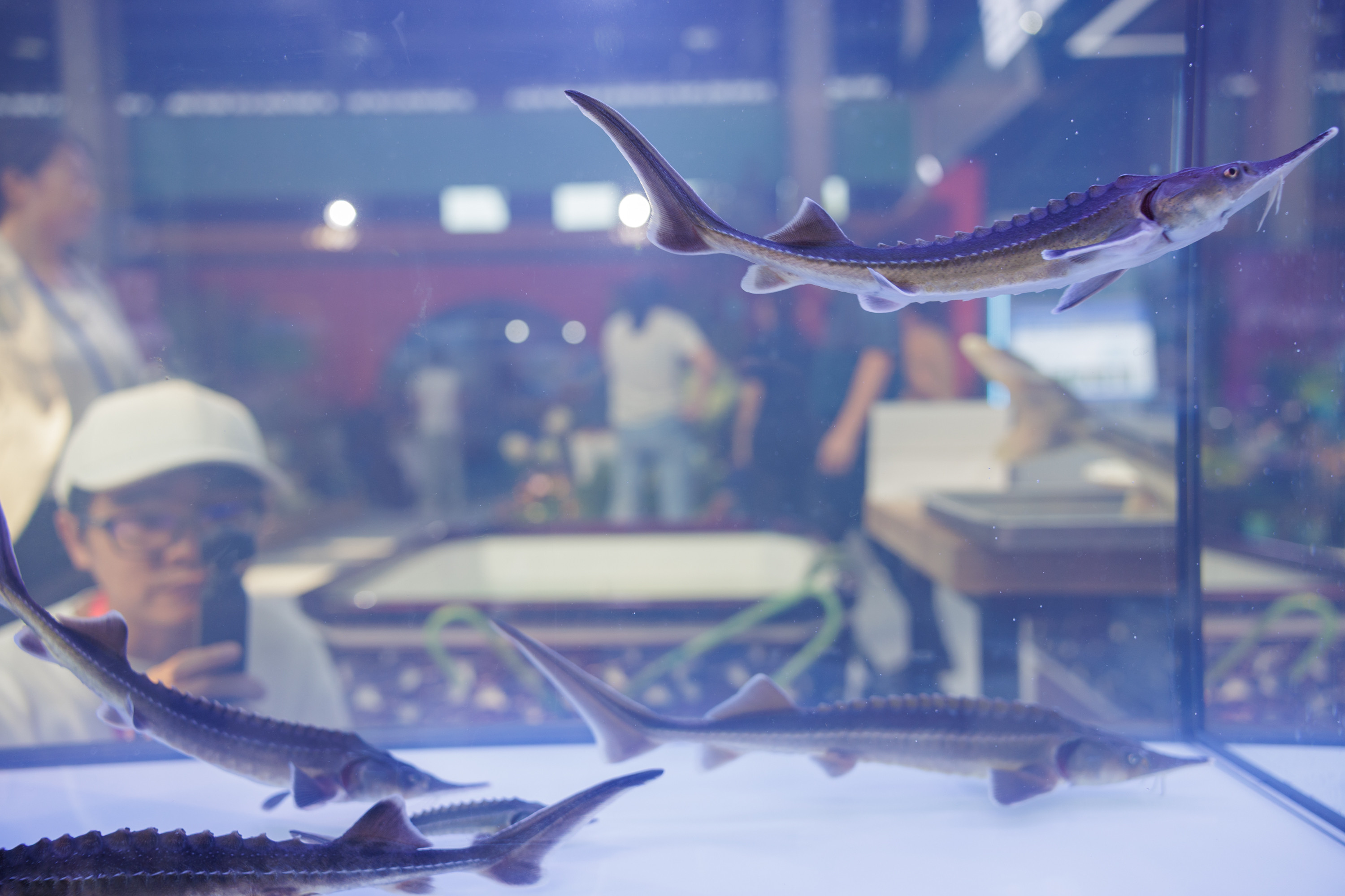 媒体记者正在拍摄京龙1号鲟鱼。新京报记者王子诚摄