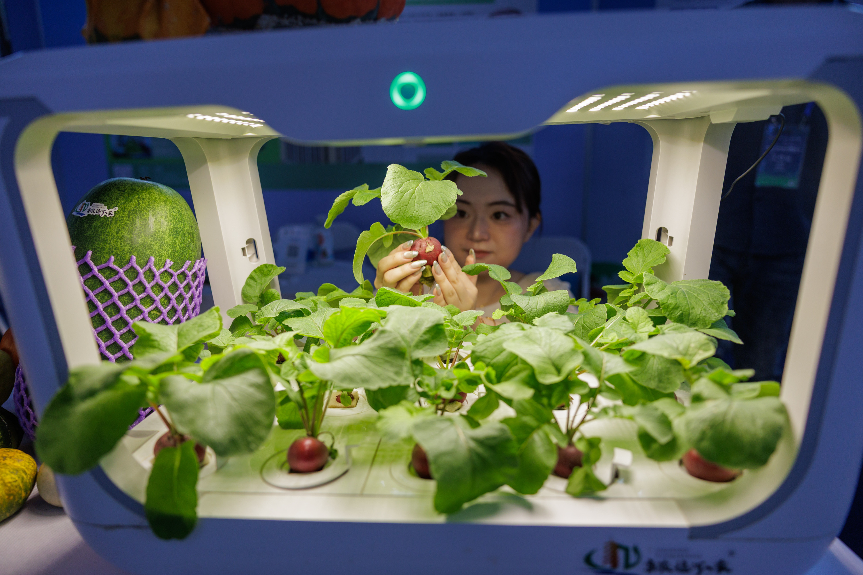工作人员正在展示智能水培箱上海配资网。新京报记者王子诚摄