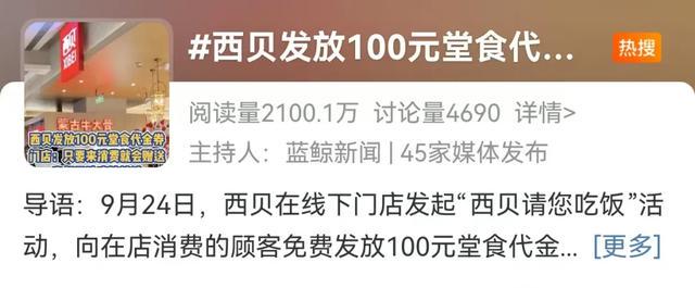 另外,就在不久前,西贝曾在线下门店发起“西贝请您吃饭”活动,向在店消费的顾客免费发放100元堂食代金券,代金券在西贝全国门店通用,但仅限堂食。#西贝##餐饮#