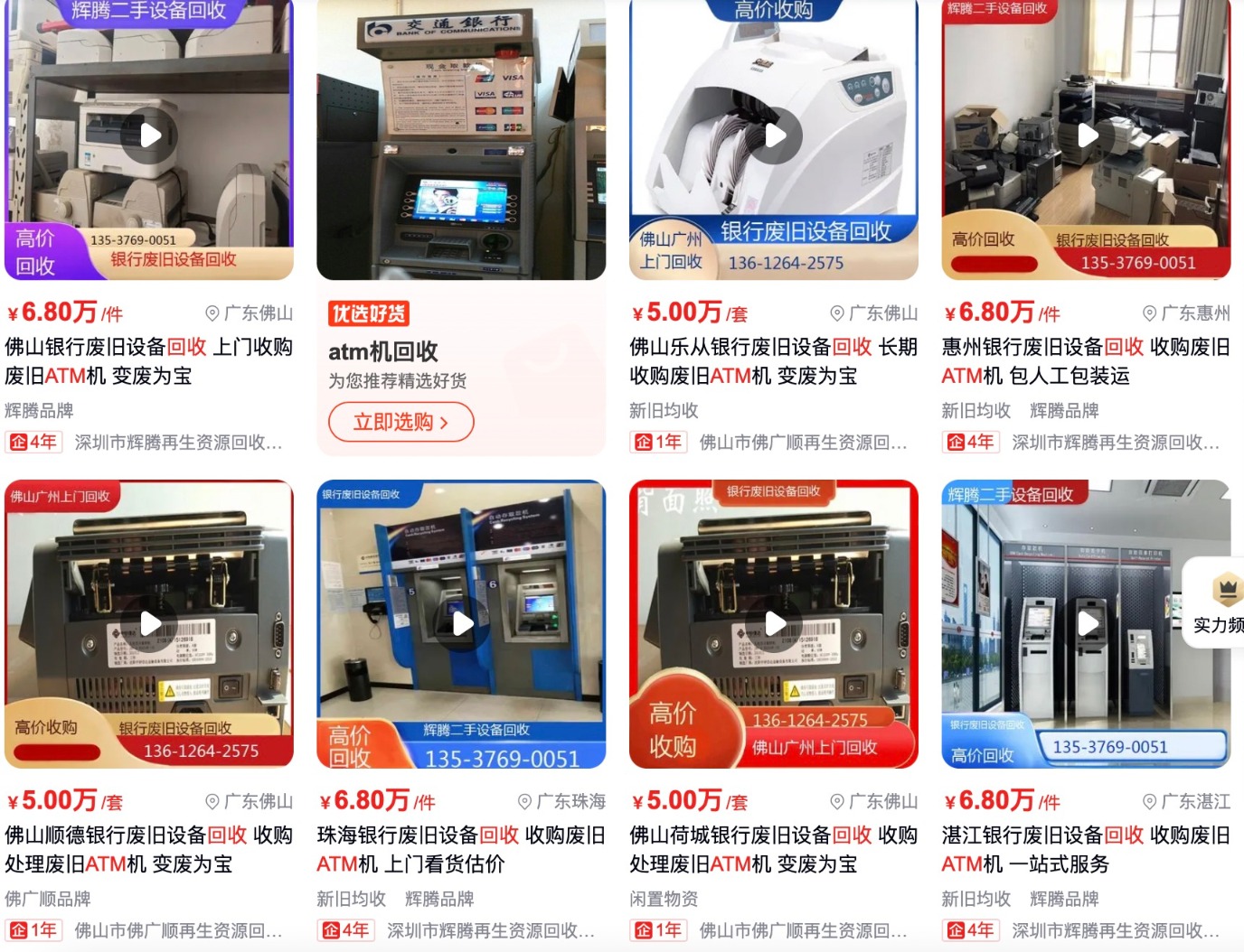 时代财经通过在百度旗下B2B平台“爱采购”搜索ATM机发现,银行的报废ATM机回收价在5万元/台左右;不过,在“闲鱼”等C2C二手交易平台,一台二手ATM机的价格则更低,仅为3000~5000元。