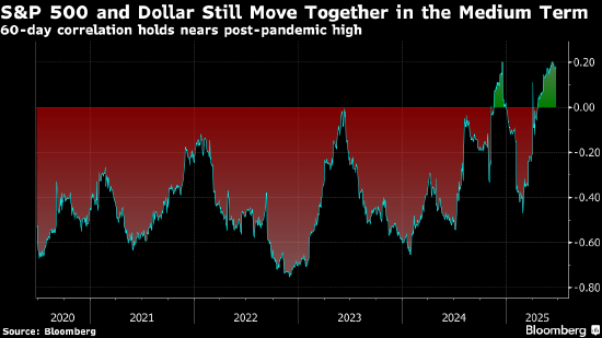 不过,从更长的时间范围——大约两个月——来看,美元仍然与美国股市保持正相关关系。这意味着,美元还是倾向于随着全球风险情绪改善而上涨,反之亦然,这与美元通常作为全球投资者避险货币的角色截然不同。